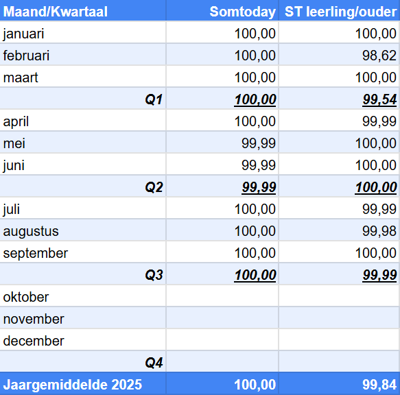 De onderstaande tabel geeft de beschikbaarheidspercentages (%) van Somtoday en Somtoday Leerling/ouder omgeving per maand en kwartaal voor het jaar 2025: