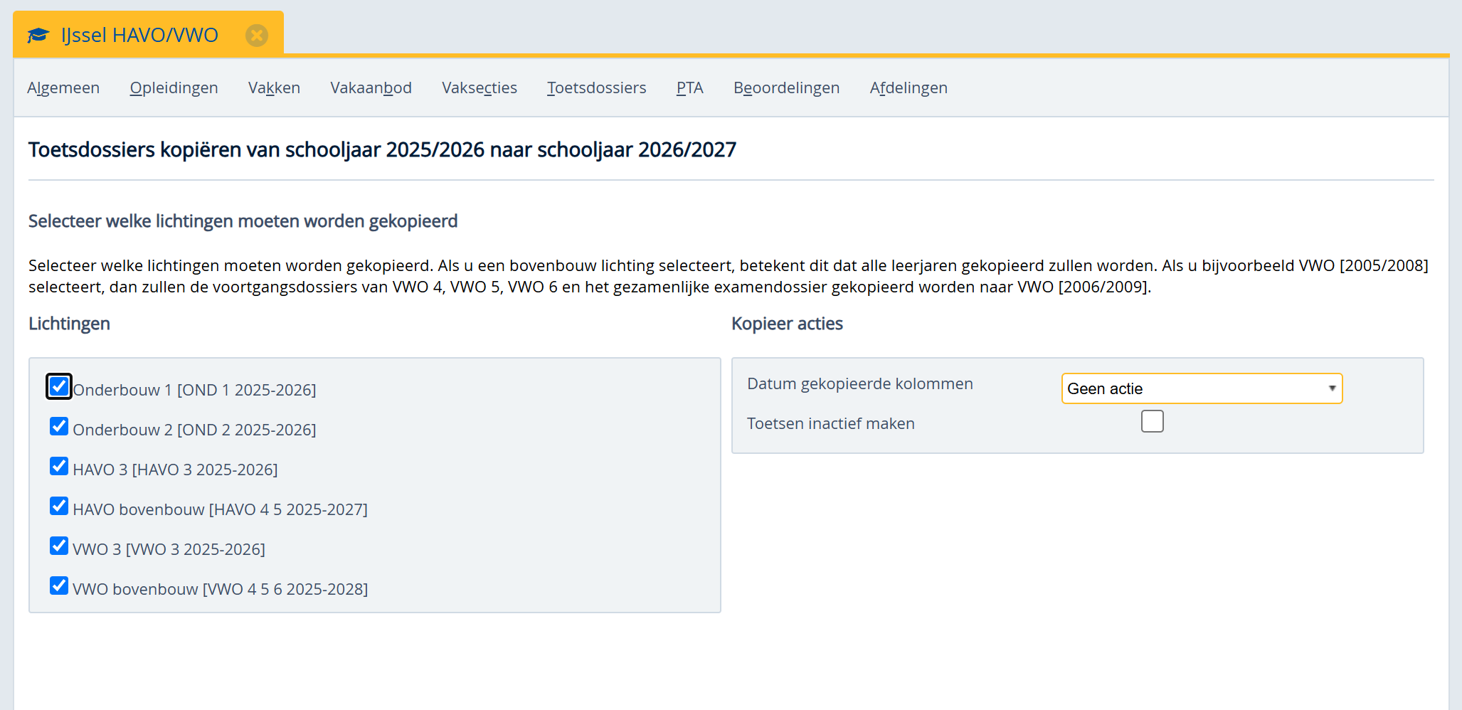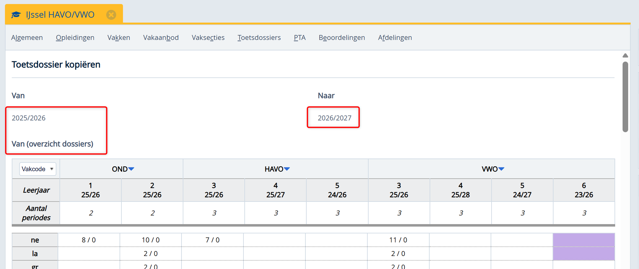 Onderwijs > [selecteer vestiging] > Toetsdossier, knop Kopiëren naar volgend jaar