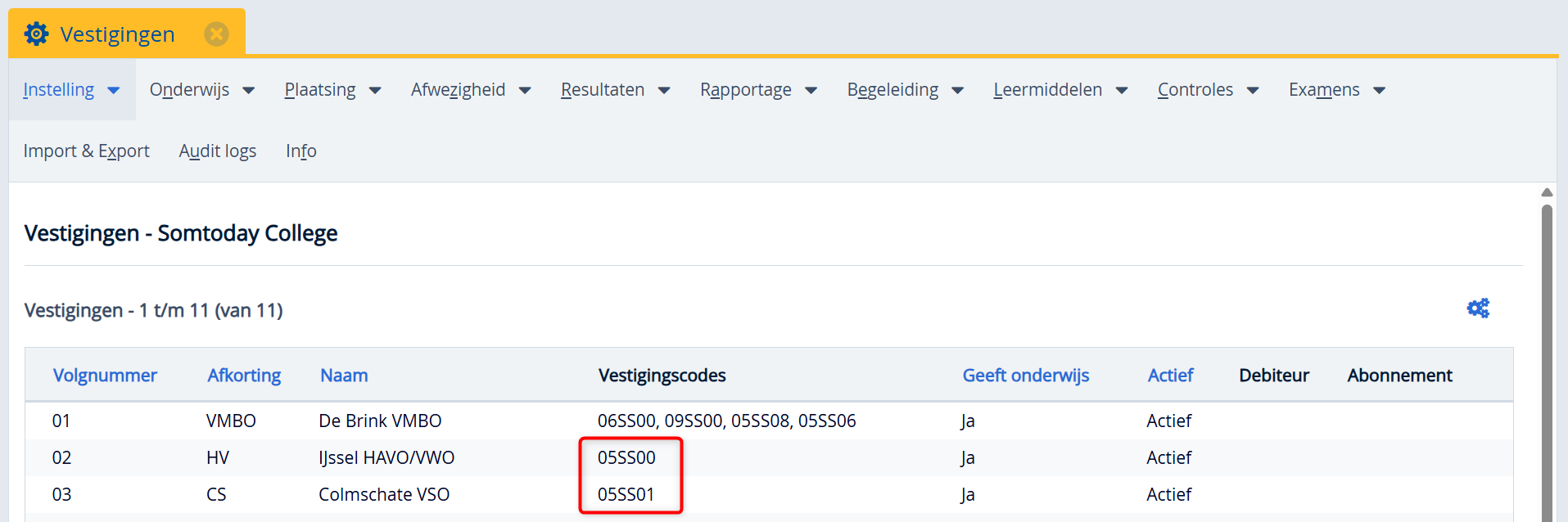 Voorbeeld: de vestiging 'De Brink VMBO' heeft verschillende vestigingscodes toegewezen op één vestiging.