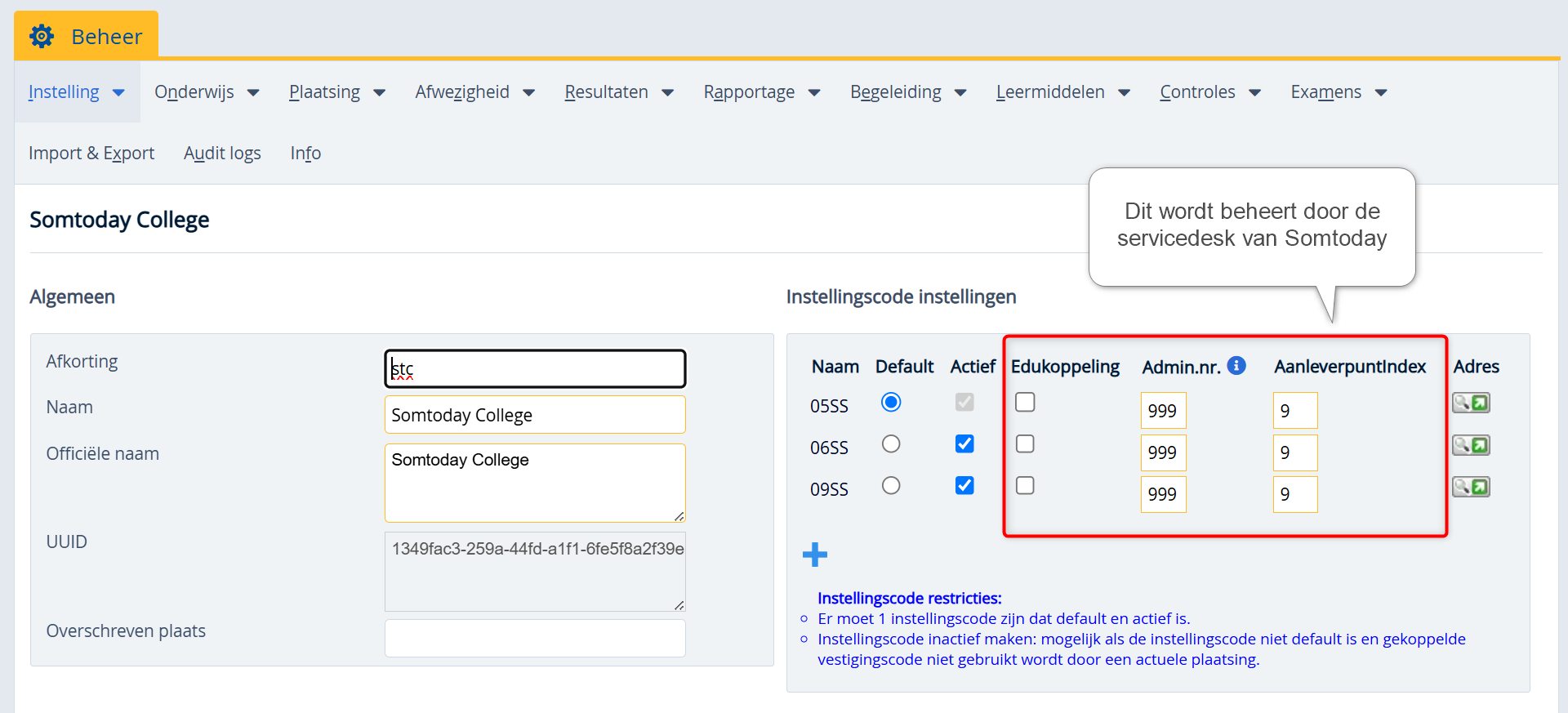 Onderstaande instellingen beheert de servicedesk van Somtoday