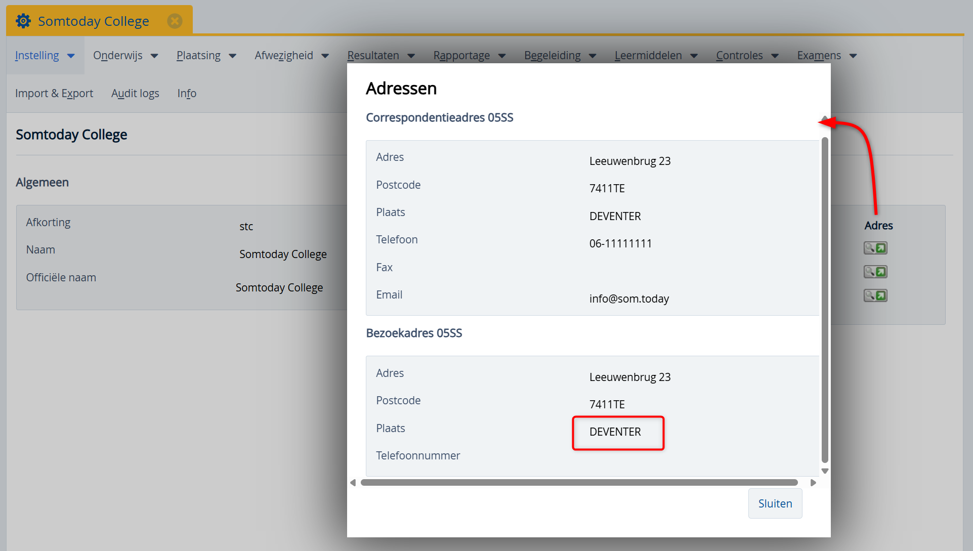 Overschreven plaats: Hierboven zie je dat Deventer de plaatsnaam is van 05SS. Deze plaatsnaam wordt getoond op het inlogscherm van Somtoday. Indien je dit niet wilt, kan je d.m.v. het veld Overschreven plaats dit aanpassen. vul dit veld in indien je de plaatsnaam op het inlogscherm anders wilt hebben.