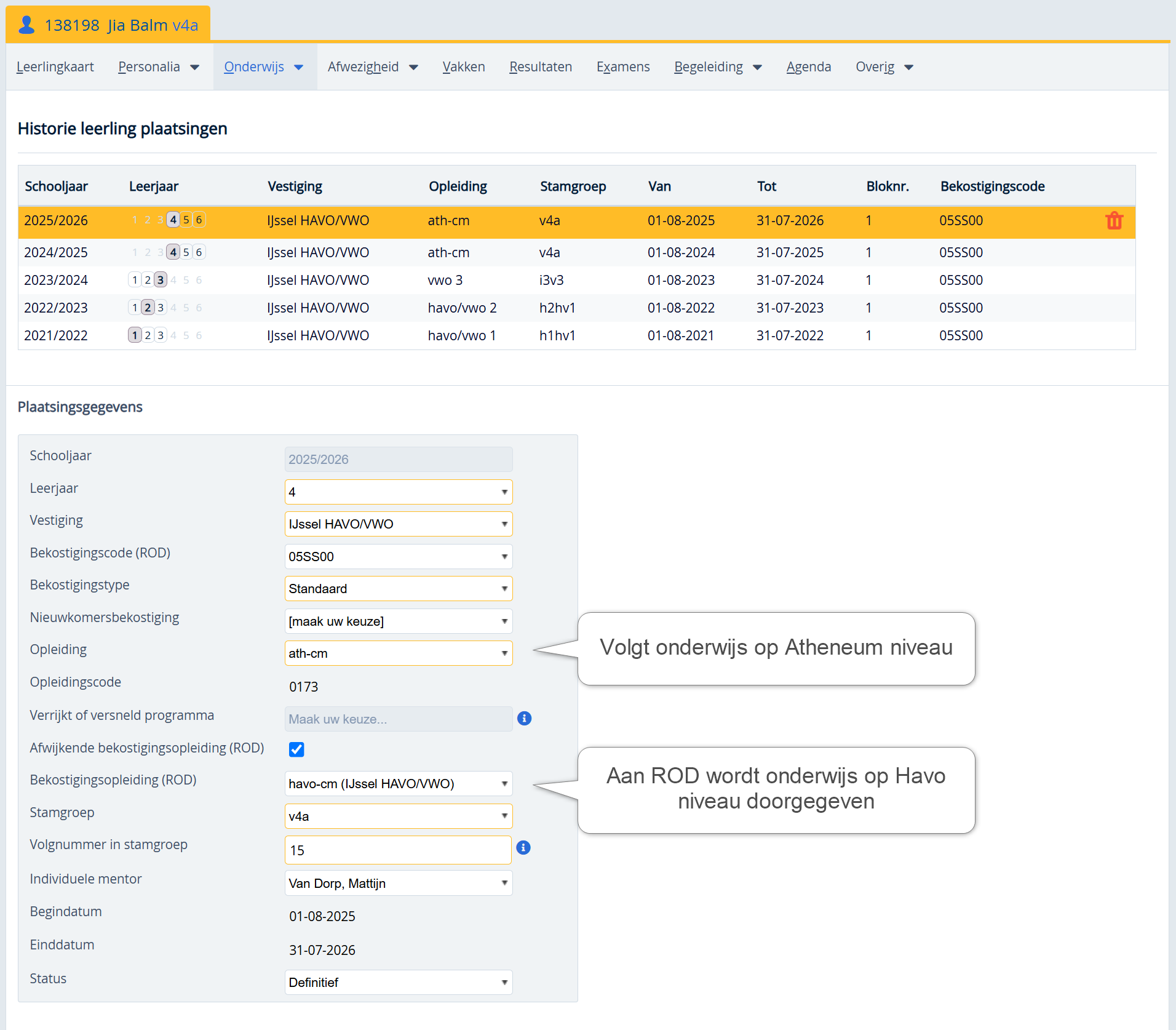 Leerlingen > [selecteer leerling] > Onderwijs > Plaatsing