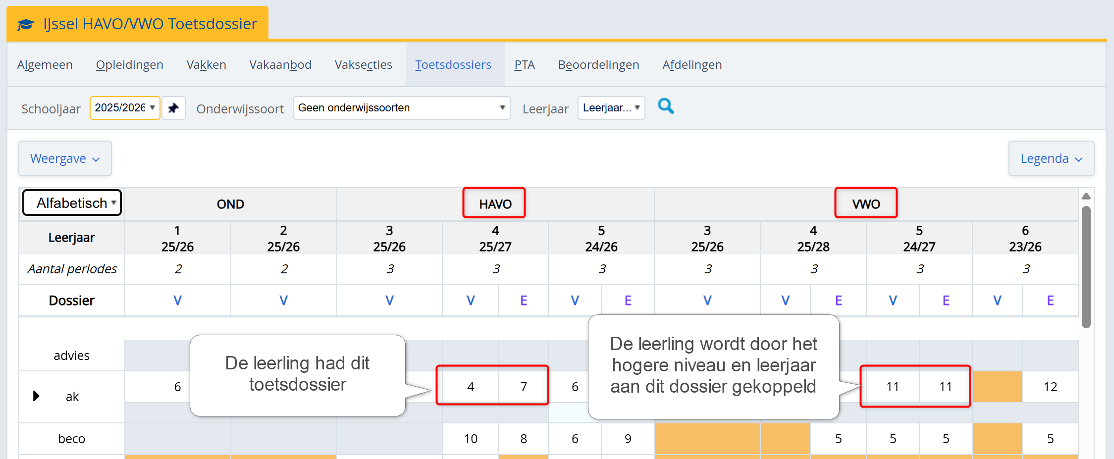 Wanneer je bij een leerling aangeeft dat hij een vak op een hoger niveau of hoger leerjaar volgt, dan wordt de leerling voor dat vak gekoppeld aan het toetsdossier op het hogere niveau of hogere leerjaar.