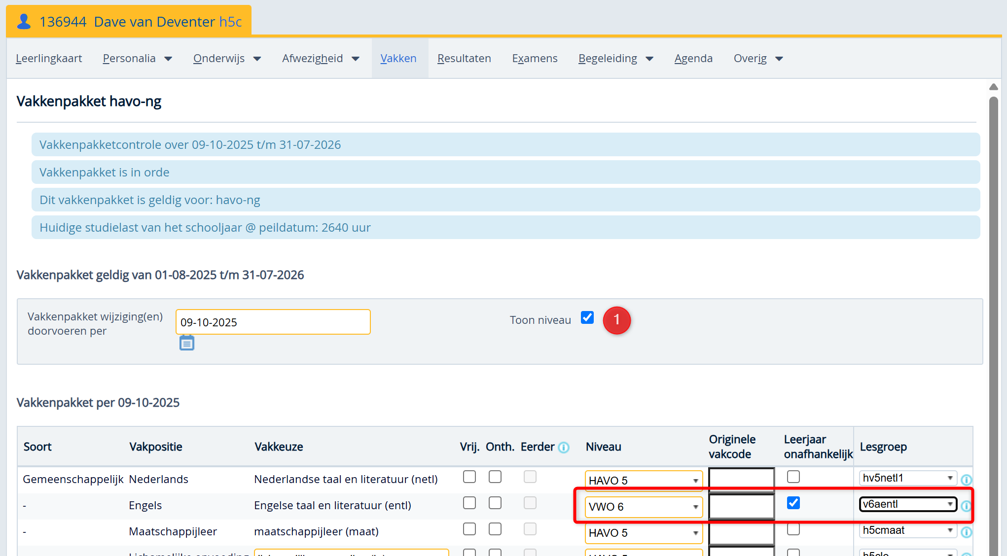 Een leerling zit in schooljaar 2025-2026 in Havo 4 en gaat een vak op hoger niveau volgen. Hij krijgt daarmee het toetsdossier van de lichting VWO 5 2025-2026.