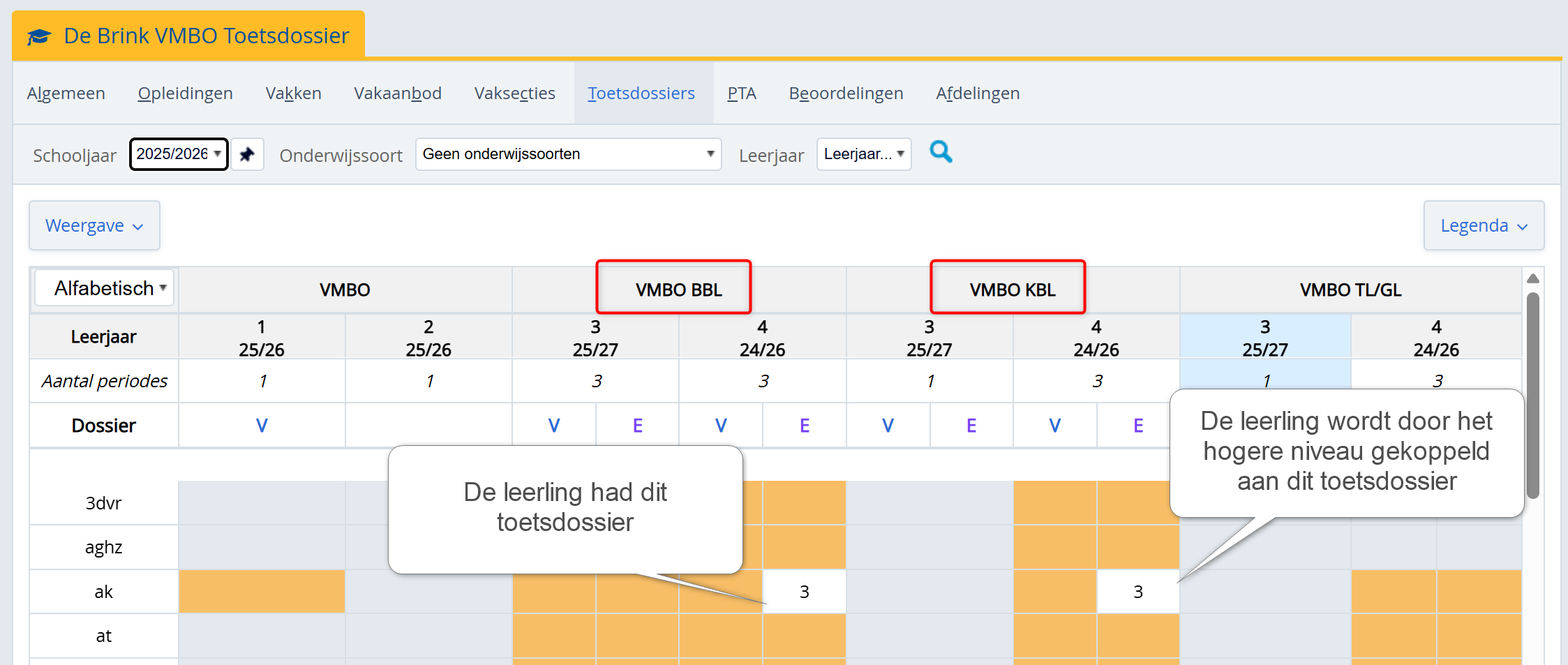 Een leerling zit in schooljaar 2025-2026 in BBL 3 en gaat een vak op hoger niveau volgen. Hij krijgt daarmee het toetsdossier van de lichting KBL 3 2025-2026.