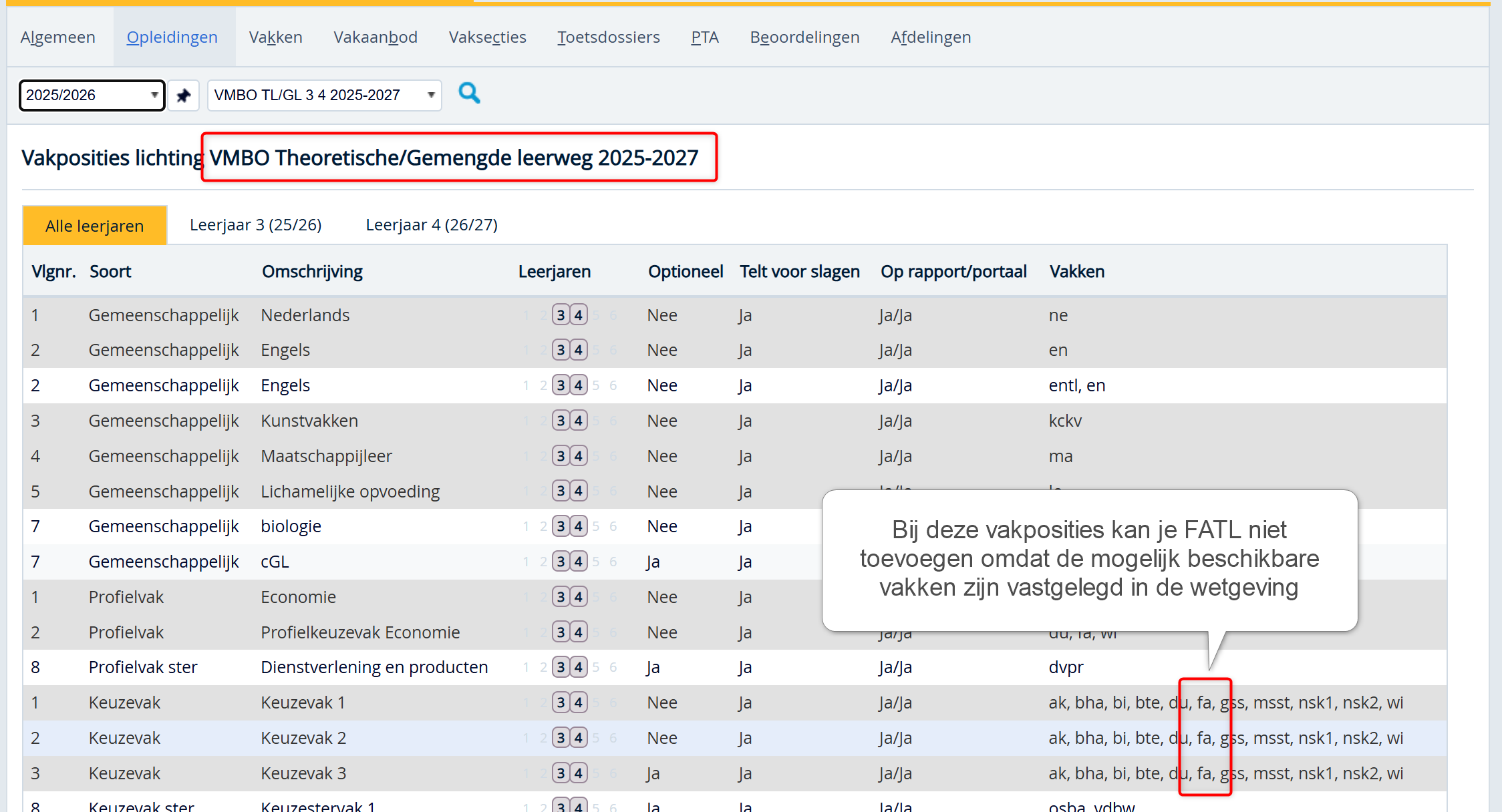 - Voeg een nieuwe vakpositie 'keuzevak 2' toe met daarin dezelfde vakken als in de landelijke vakpositie en voeg nu ook Fatl (1003) toe. Er is nu een witte vakpositieregel ipv grijze vakpositieregel gemaakt.