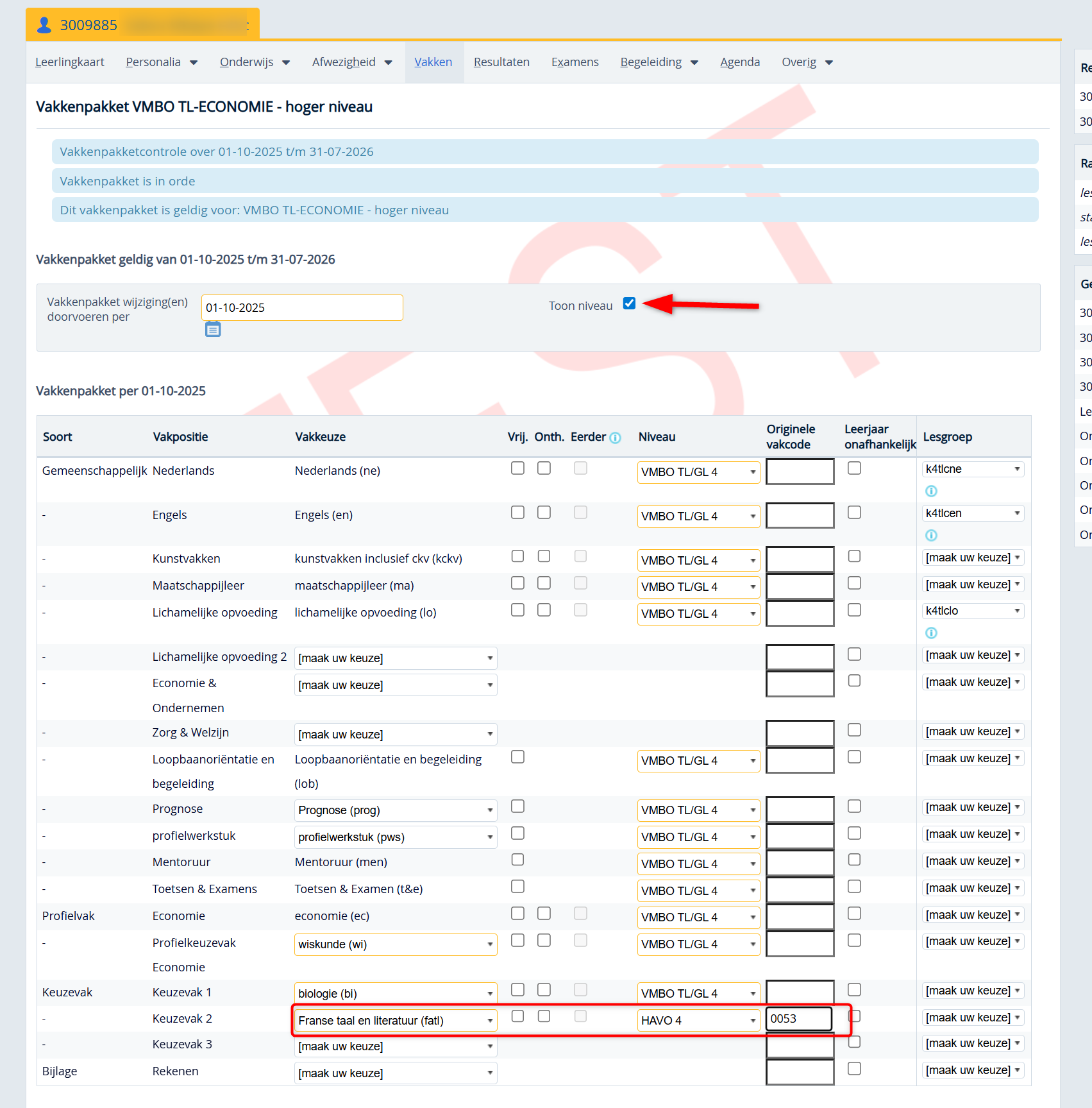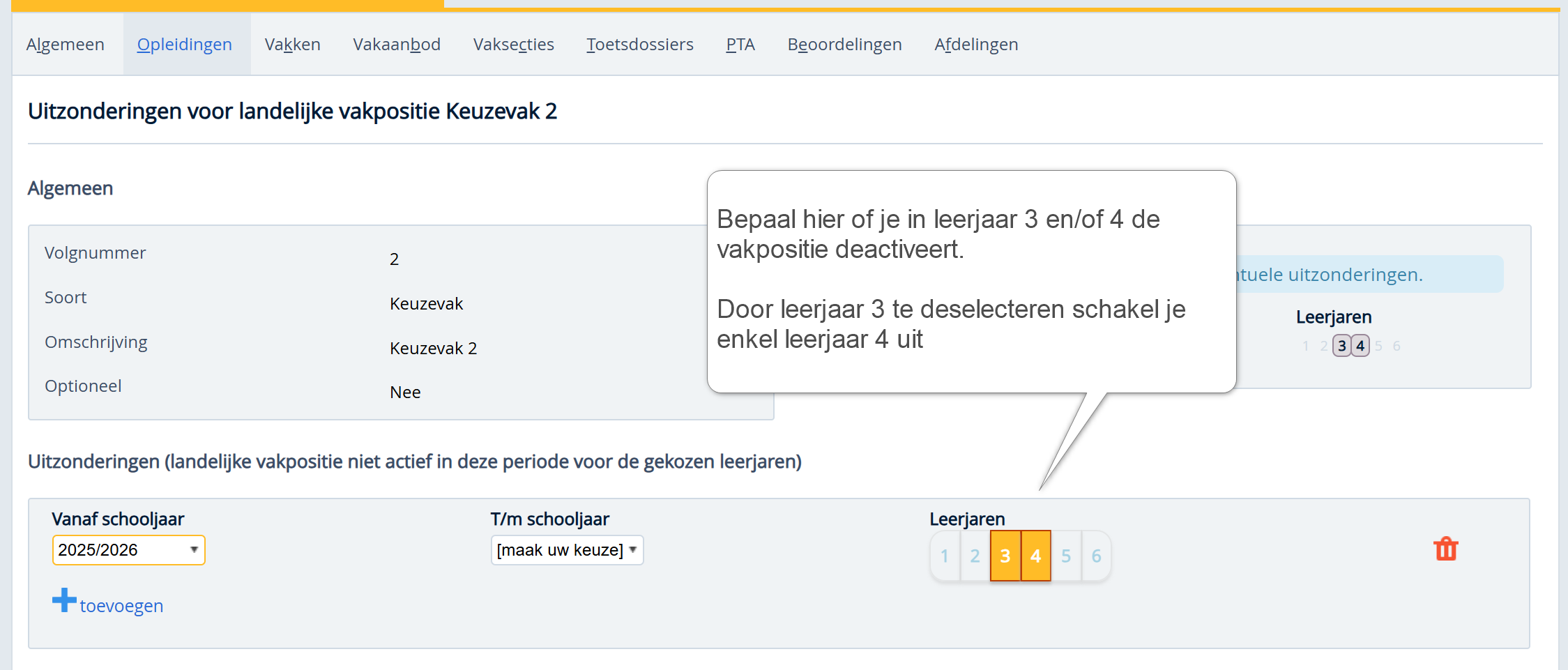 - Ga naar de opleiding van de leerling en deactiveer via de grijze landelijke vakposities 'Keuzevak 2'.