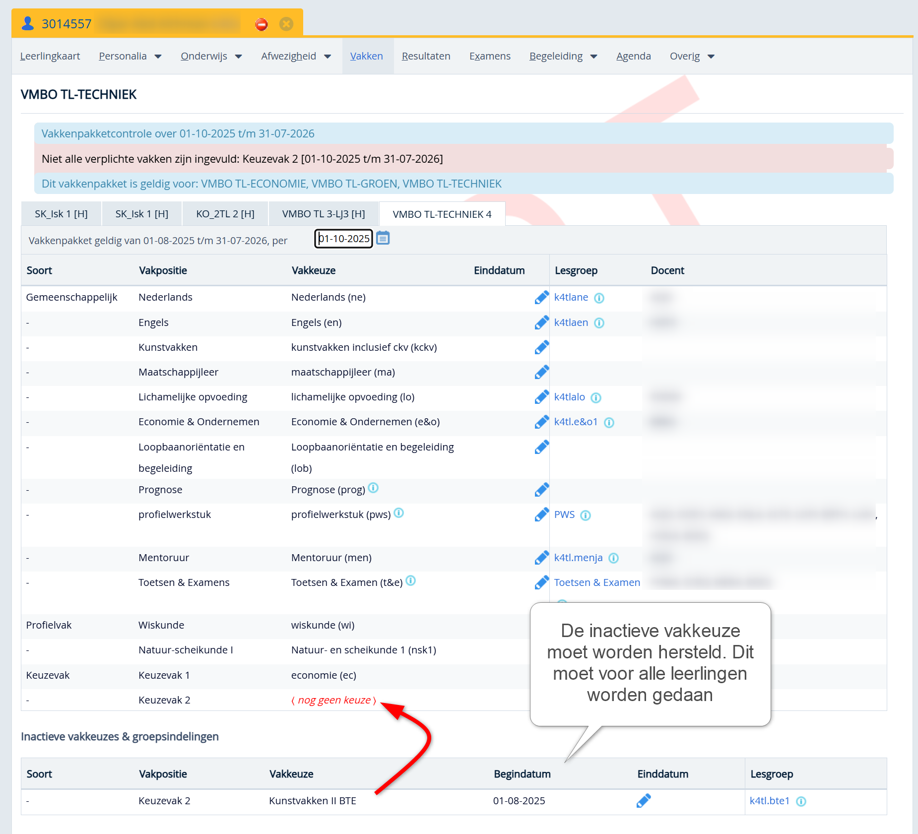 - Herstel bij alle andere leerlingen de inactieve vakkeuze. Mocht je ook leerjaar 3 hebben meegenomen in stap 2, doorloop dan ook alle leerlingen van leerjaar 3