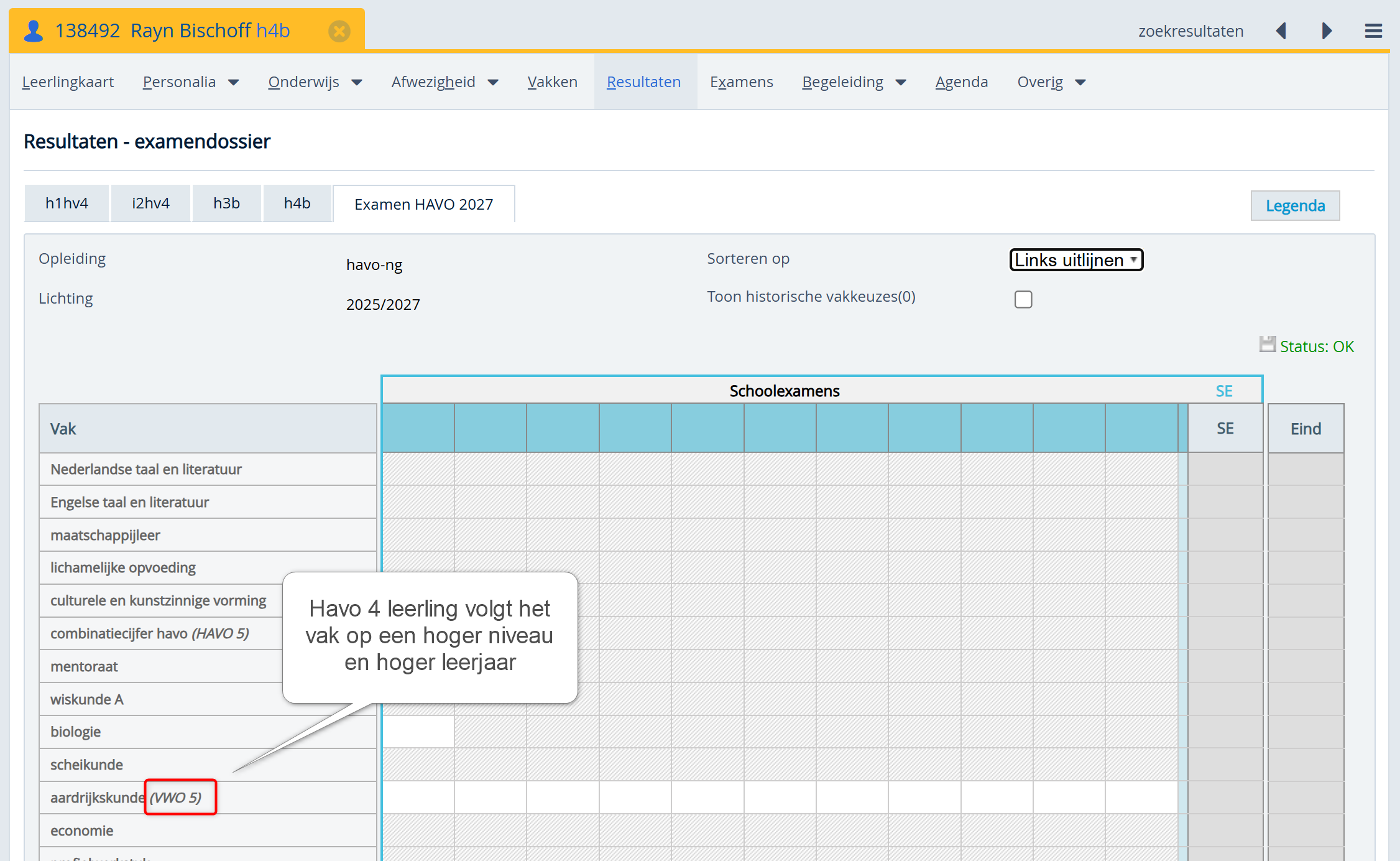 Voorbeeld 2: Havo 4 leerling volgt één vak op hoger niveau