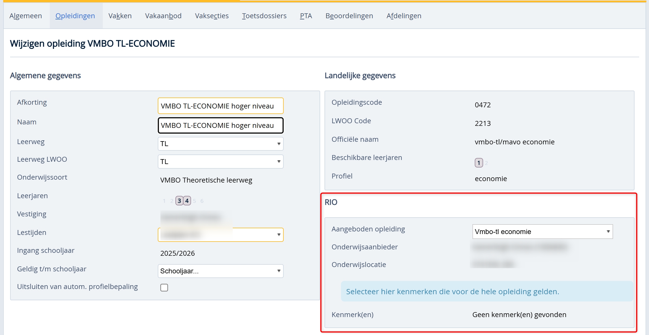 Onderwijs > kies vestiging > Opleiding > kies opleiding > knop Wijzigen en zet het vinkje.