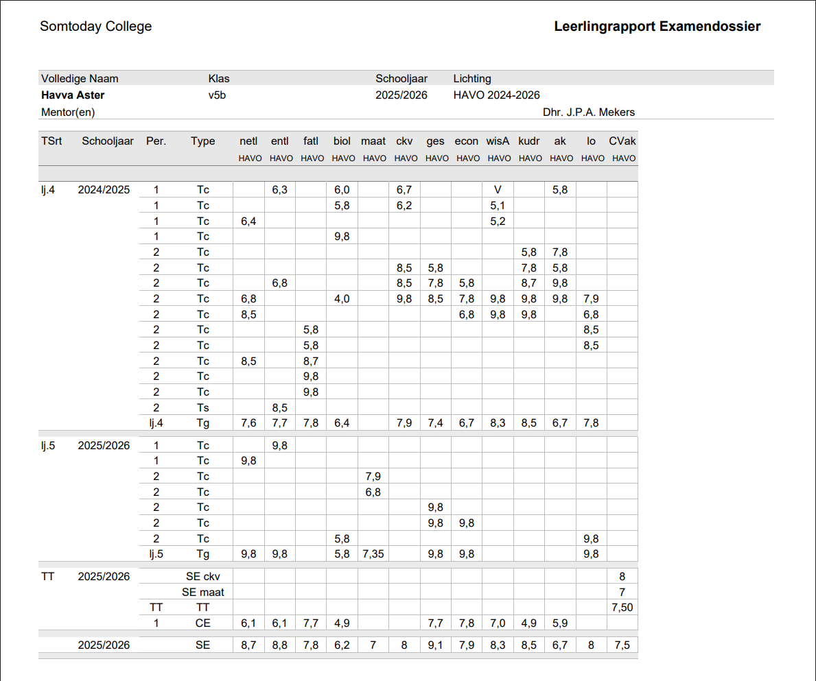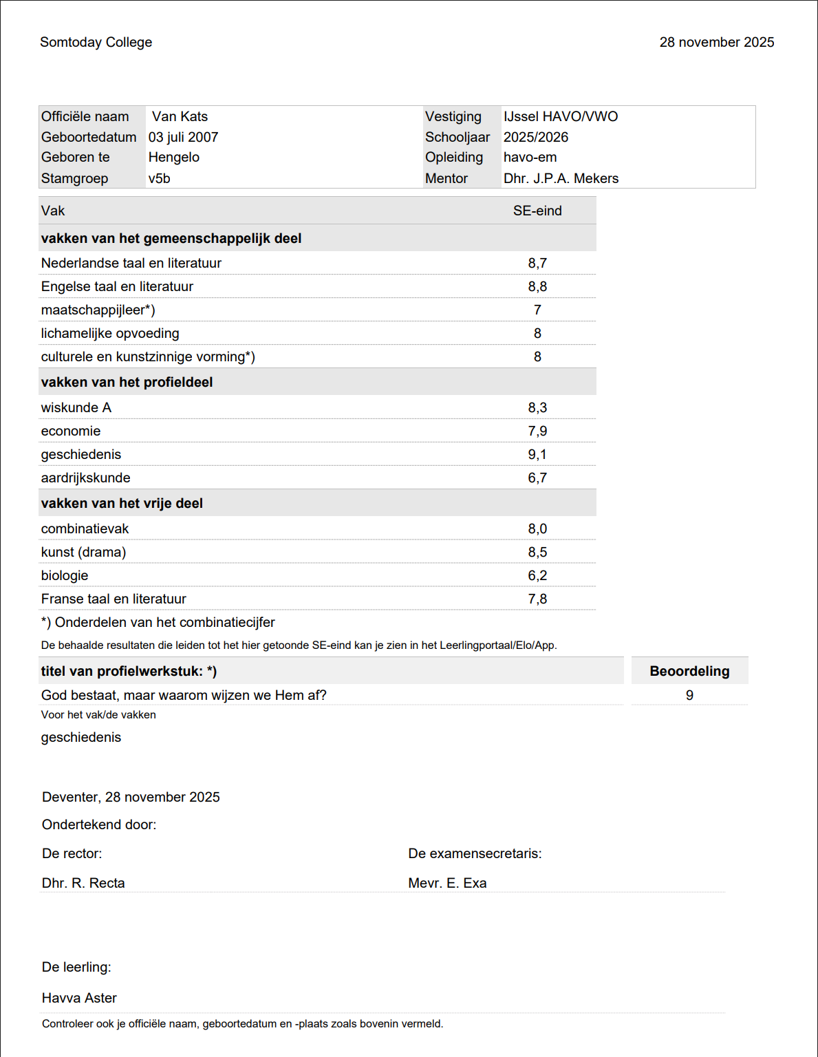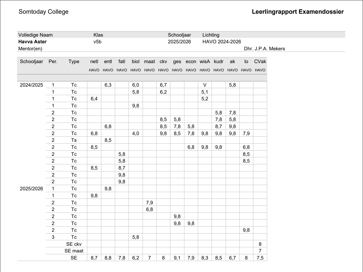 Deze lijst is te gebruiken om te voldoen aan het wettelijke voorschrift om de leerling voor aanvang het centrale examen de SE cijfers te overhandigen waarbij wordt verwezen naar een gedetailleerd overzicht van alle cijfers die voor de leerling online inzichtelijk zijn in Somtoday Leerling.