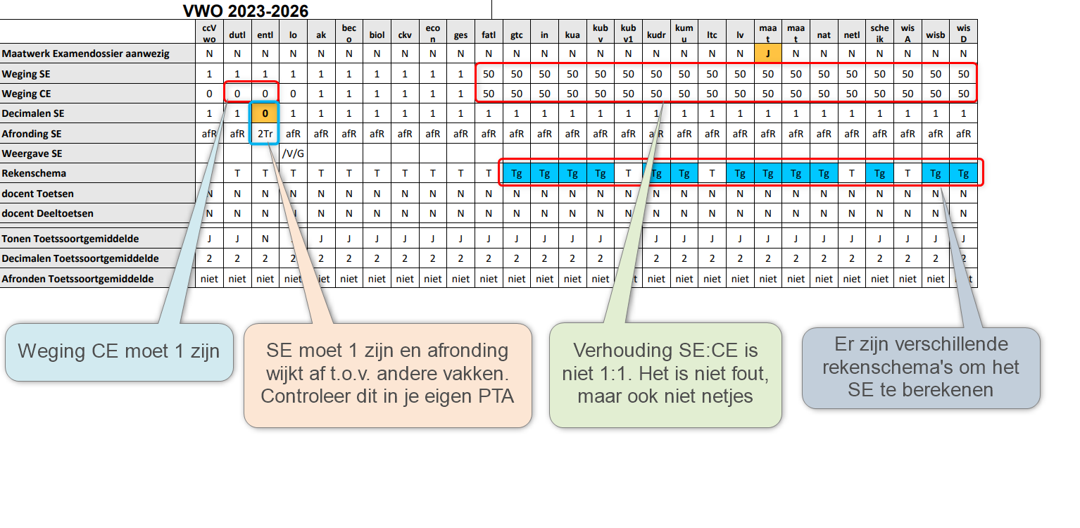Toont de inrichting van het toetsdossier. Hiermee zie je snel de verschillen tussen de instellingen van de vakken.
