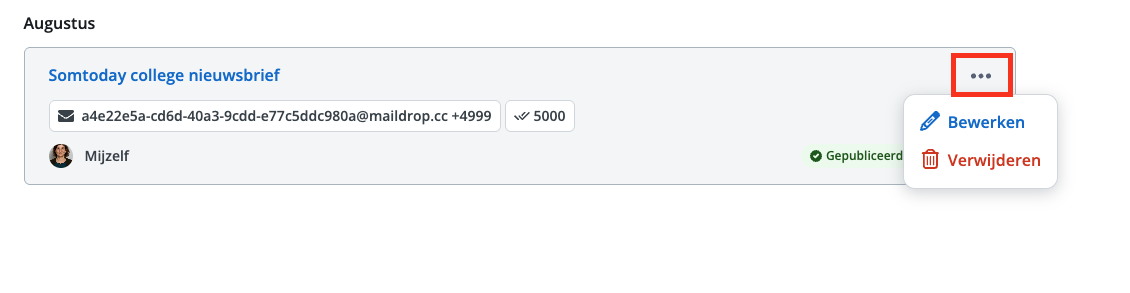 Toch een foutje in een nieuwsbericht of de bijlage vergeten toe te voegen? Bij jou eigen nieuwsbericht of het hebbe van overkoepelende rechten kun je de titel en de inhoud van het bericht na het publiceren aanpassen. Het betreffende bericht kun je bewerken door op de drie puntjes naast het nieuwsbericht te klikken.