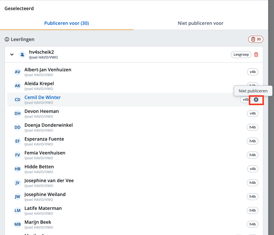 Klik in dat geval op het kruisje achter de naam van de leerling om deze uit de lijst met ontvangers te verwijderen.