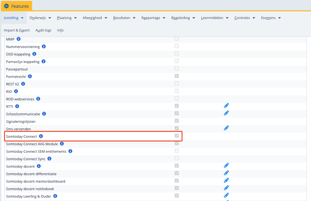 Indien Somtoday Connect afgenomen is, zal dit als feature in de lijst als aangevinkt weergegeven worden.