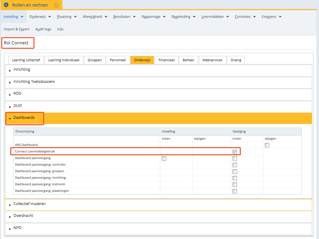 dashboarding, waar je het recht Connect leermiddelgebruik vindt. Vink dit recht aan en