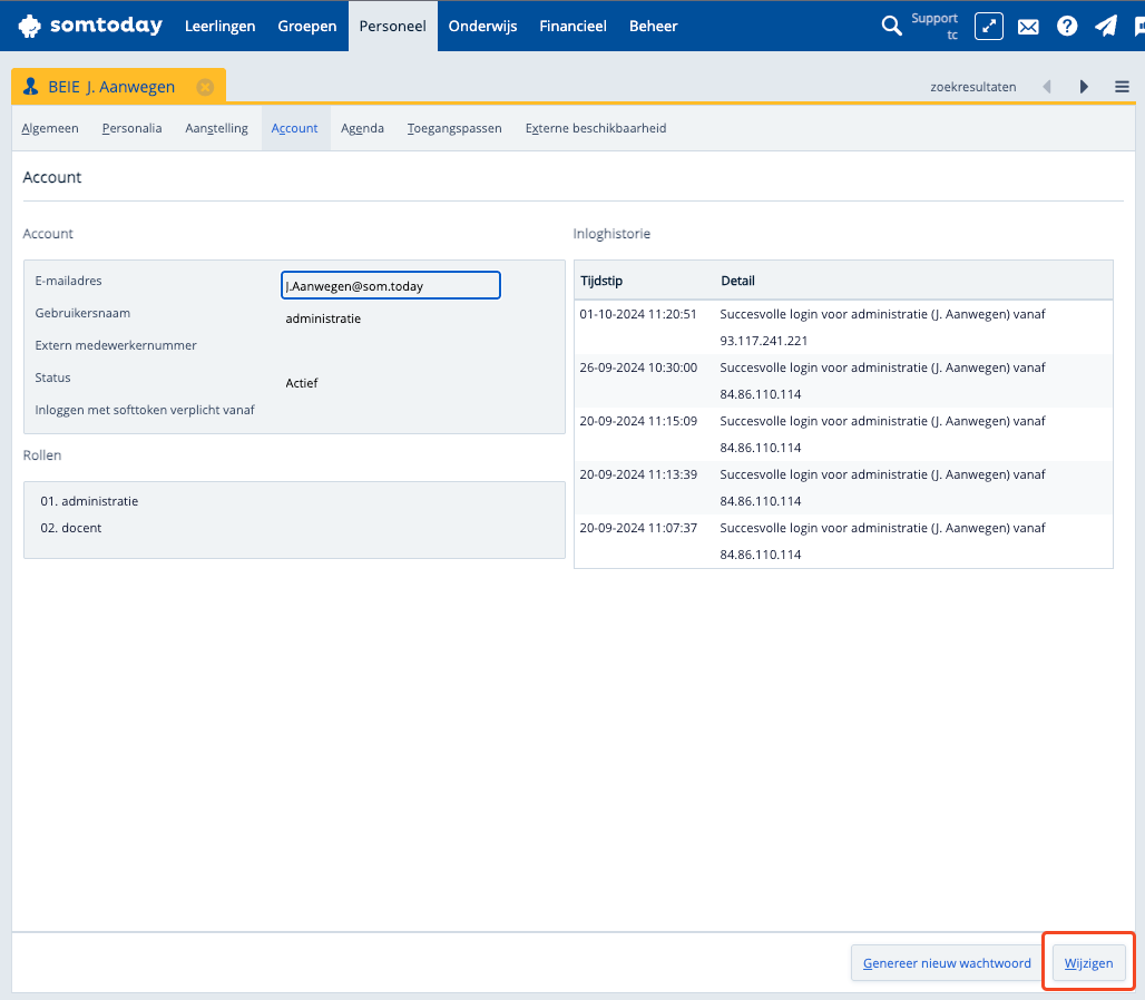 Ga naar de accountpagina van een medewerker en klik op wijzigen:
