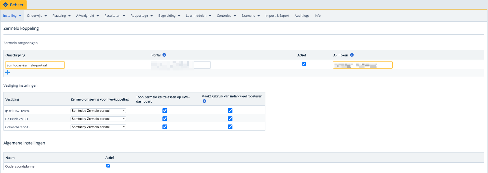 Ga naar Beheer > Instelling > Features > Zermelo koppeling; staat deze nog niet aan, neem dan contact op met de Somtoday Servicedesk. Voeg hier de Zermelo-omgevingen toe en activeer de optie "Ouderavondplanner"