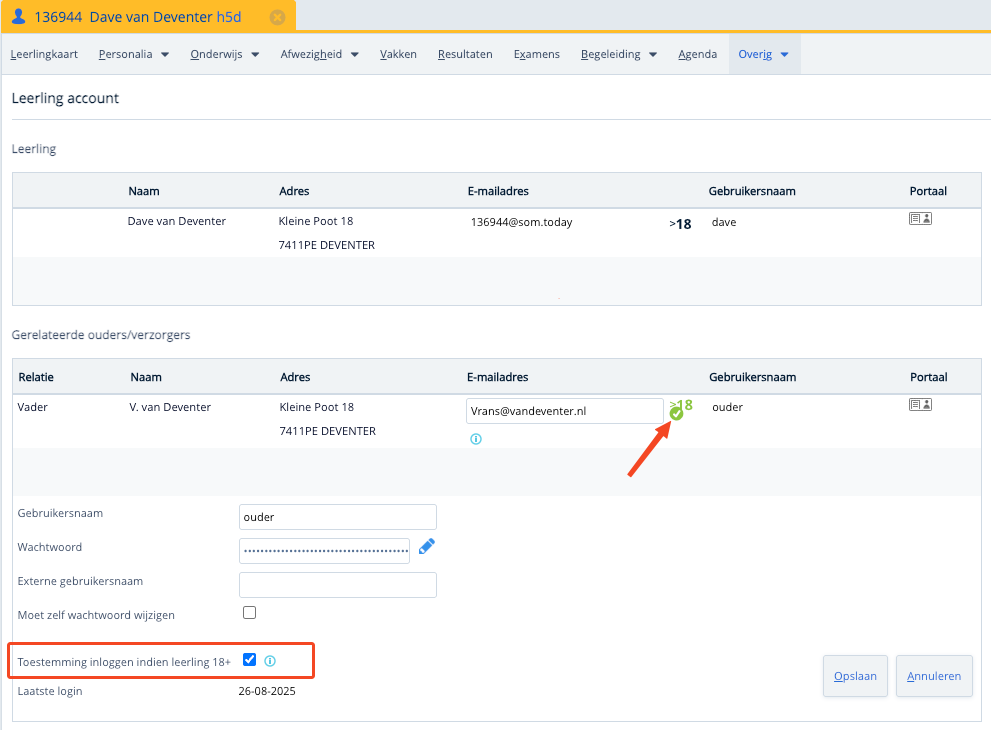 - Voor 18+ leerlingen is geregistreerd dat de verzorger mag inloggen, zie Verzorger accounts uitgeven