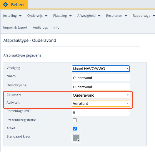 Voor alle vestigingen moet er een Afspraaktype zijn aangemaakt met de categorie Ouderavond. Zet de Activiteit op Optioneel.