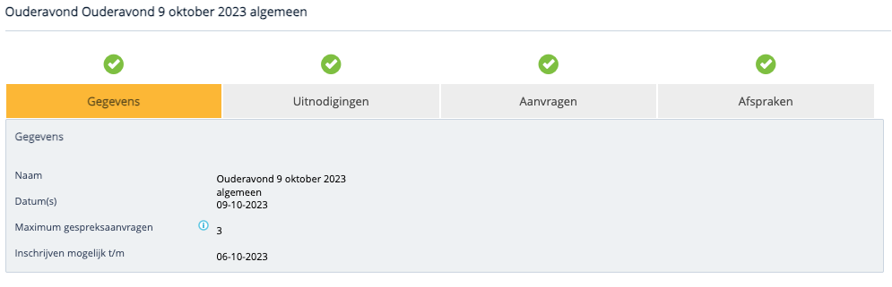 Gegevens: hier worden de gegevens van de ouderavond getoond zoals de naam, de datum(s), het maximum van het aantal gespreksaanvragen per leerling en de uiterste datum van intekenen.