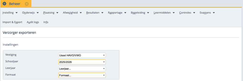 Als je gebruikt maakt van deze export , dan is het belangrijk dat de gezinnen correct zijn samengesteld in Somtoday. Je kan gebruik maken van het hulpmiddel in Somtoday voor het ontdubbelen van adressen en verzorgers. Deze is te vinden bij Beheer > Controles. Dubbel ingevoerde ouders of adressen die in opmaak kleine verschillen vertonen (21a versus 21A versus 21 a) kunnen zo worden rechtgetrokken zodat de vorming van gezinnen beter verloopt.