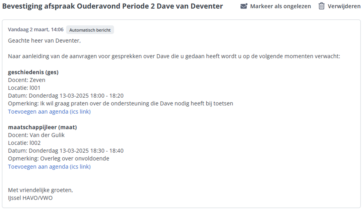 Bovendien ziet zowel de leerling als de ouder de afspraak in de agenda van de leerling. Bij het selecteren van de afspraak vindt de ouder of de leerling meer informatie.